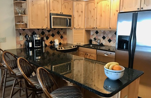 No amenity has been overlooked in providing you with a comfortable stay. The living room stacked stone fireplace will provide a cozy, welcoming atmosphere on cold winter evenings. A 48" flat screen HDTV is ready for indoor entertainment, along with a soundbar and BluRay player. The kitchen has been updated with gorgeous birch cabinetry and oil rubbed bronze knobs, granite countertops, and brushed nickel fixtures. It is readily equipped with everything necessary for light cooking or large feasts. New top of the line stainless steel appliances complete this kitchen so that any gourmet will feel right at home. Seating for four is convenient at the granite bar.