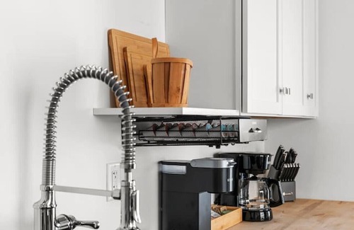 The coffee & tea bar features a 12-cup coffee maker and a Keurig. We also supply a starter set of ground coffee, filters, K-cups, tea, creamer, sugar, and stevia to get your mornings started right.