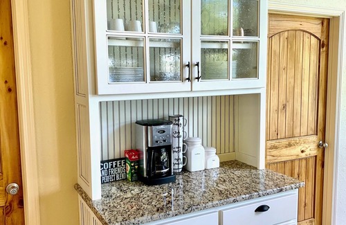 Start your morning with a steaming cup of coffee as the sun rises or unwind in the evening with a refreshing cocktail while soaking in the serene lake views from the covered patio. The lake is just a short walk away, down a gently sloping hill, perfect for a peaceful stroll. For those who enjoy outdoor cooking, a Weber kettle and grilling tools are provided right next to your patio.