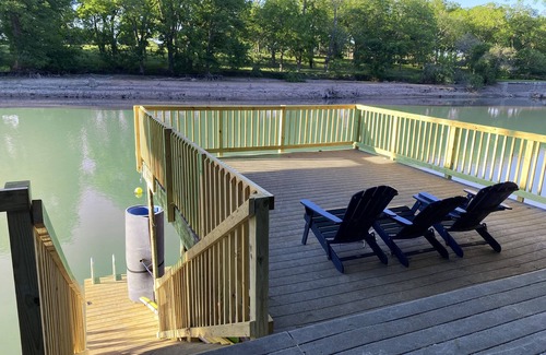 UPDATE!! Lake McQueeney is now a river (photos are current!). It has been lowered 8ft to allow for Dam repair. We still have 4-5 ft deep water at the end of our dock and the river is very usable!!! It is great for kayaking/swimming/fishing but it is not boatable in a motor boat, and the slide is unusable. You are still able to swim and paddle for miles down the river. We have built a lower dock to provide easy access to the water with Kayaks and paddleboards. We also keep a pump around for inflating tubes and other floaters. The lake is expected to be drained for two years.