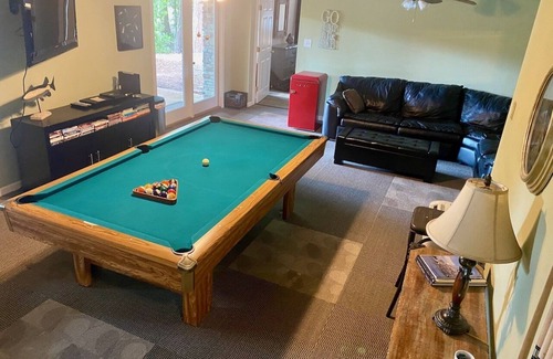BASEMENT: Has a pool table with a convertible ping pong table, large flat screen TV, blu ray DVD, large leather sectional, 2 bedrooms, full bath and the laundry room. One bedroom has a king-size bed and the other has a queen-size bed and a bunk bed. Added in May 2023, Multicade Arcade Machine with Pacman and 40 other games.