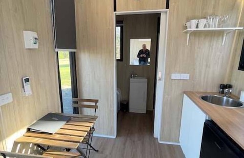A comfortable, 139-square-foot accommodation is set in one of the best tiny house rentals and serene locations with abundant natural bushland, easy access to water, split air conditioning, a kitchenette, cooking equipment, and excellent bathroom facilities. These amenities include an eco-friendly cassette toilet with a removable waste holding tank, hand basin, and shower (gas-heated for hot showers).