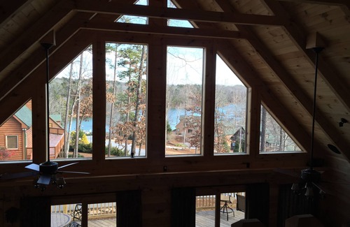 Newer Log Cabin built in 2014 in Serenity Bay Deep water Cove on Southwestern Lake Keowee. Lakeview home steps away from our dock Bring your boat or rent one and enjoy all of Lake Keowee activities. Gas/ramp only minutes away. Swim and fish from dock. Sleeps 8-10. Two bedrooms downstairs with open loft upstairs 2 King beds,2 Queen beds 1 sleeper sofa,2 showers stalls. 1 tub enclosure All granite counters fully equipped kitchen, wrap around deck with furniture with screened in porch gas grill Open Living room 2 leather couches 55' TV, Internet, Sonos sound system, Dining seating for `10. Laundry room. The Blue Ridge Mountains not far away with the Lake offering Fishing, Sailing, power boating, Canoe and Kayaking and Waterfall parks for hiking nearby. Convenient to Food Stores, Great Restaurants, Close to Clemson University and Greenville for Big City Nights. We also accept PAY PAL