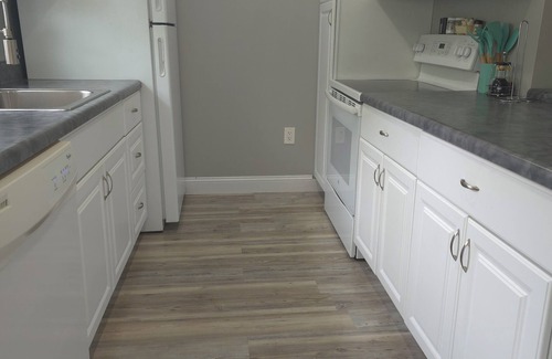 Angler's Retreat features two bedrooms and one full bathroom with a tub and shower. One bedroom features a queen size bed with an attached entry/outdoor view of the yard. Bedroom 2 has three twin size beds in the room with all linens provided. The kitchen and laundry area are fully stocked with everything you need to enjoy your stay.