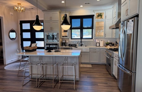 Escape to a soothing 5-bedroom house in Seneca. With 4 king beds and 1 queen bed, this retreat offers a peaceful ambiance for guests. New construction craftsman-style home on beautiful Lake Keowee. Enjoy an exclusive getaway with room for the entire family. Built on a flat lot situated steps away from Keowee's pristine waters.