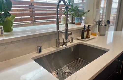Head downstairs on the custom concrete staircase to the spacious kitchen. Fully stocked with everything you will need during your trip. The kitchen includes 2 ovens, oversized fridge and 6 burner gas stove. Large stainless sink with industrial faucet. Plenty of counter space and island to prep meals. 2 counter stools and seating at custom dining nook for aprox 8 people.