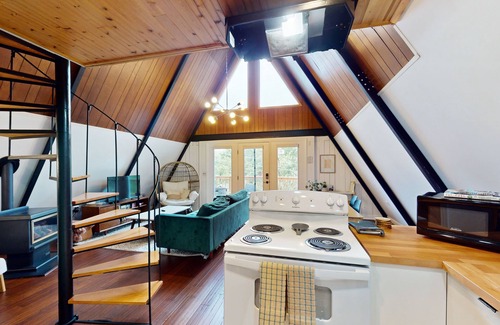 The Lost Haus, under new ownership and recently remodeled, is a charming A-frame retreat blending minimalist and modern décor. Relax in the insanely comfortable egg chair or curl up on the velvet couch for ultimate relaxation.