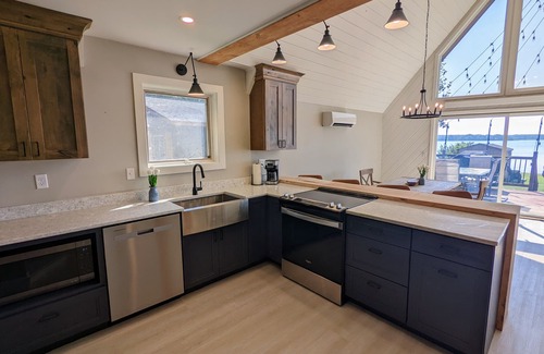 Immerse yourself in the luxurious comfort of the leather furniture in the living space, which includes a convenient pull-out sofa for additional sleeping accommodations. Unwind while watching your favorite shows on the 55" Samsung Smart TV. Adjacent to the living area, the tastefully remodeled kitchen boasts modern navy cabinets, new appliances, and bar-top seating, allowing you to relish in the gorgeous lake views while preparing meals. Retreat to the main-level bedroom, where earthy tones and nature-inspired décor create a captivating ambiance, or escape to the lofted bedroom, which exudes tranquility with its light, airy tones. Both rooms feature comfortable king beds with unique handmade headboards crafted from local wood. The loft area also offers an en-suite bathroom and an open space with a built-in queen bed, providing the perfect spot for relaxation while gazing at the star-filled sky over the lake. The patio area is ideal for unwinding with loved ones while grilling delicious meals. As the sun sets, the string lights illuminate the space, creating a magical atmosphere for enjoying drinks and cozy conversations around the bonfire pit, which comes with 4 chairs and is situated directly across from the sauna.
