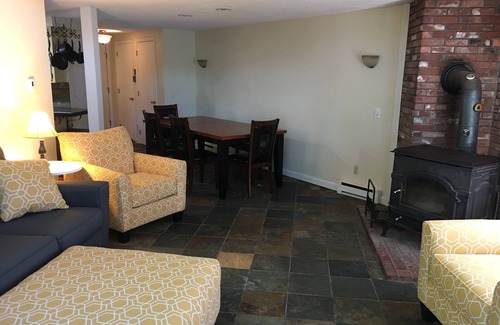 Fully furnished 2 bedroom, 2 full bathrooms + sleeping loft condo on Eastman lake. Two story wall of windows and outdoor deck about 30 feet from the water's edge! Steps away from two beaches with great swimming, activity center with indoor pool/fitness room/game-room, hiking trails, golf course, tennis courts and fishing. Unit updated with slate flooring, granite tile counter-tops, stainless steal appliances including dishwasher, and In unit washer/dryer. A mounted flat screen HDTV with dvr/double play channels/steam pics. High speed cable wireless internet also included. Unit also features a new in 2022 wood-stove with large window to view fire.