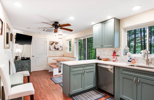 Welcome to pure lake life, just 35 feet from the water! Light up the firepit or the gas grill, or head out on the canoe - it's your lakeside vacation, and you have 100 feet of private lakefront to enjoy. This cabin is uniquely set on a pine hill, so you'll feel off in your own world as the setting sun shines upon the cabin. Inside, central air conditioning will keep everyone comfortable while you relax with a board game. The full kitchen features a tile backsplash, a French door fridge, and a dishwasher to help with cleanup. Enjoy meals outside or in the built-in breakfast nook.