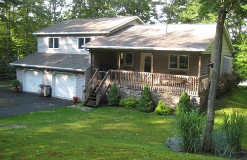 Nestled in the Poconos of northeast Pennsylvania this contemporary, comfortable, and cozy luxury home is situated on a 19-acre lake abundant with fish and shoreline wildlife, and has its own private lake access and old-fashioned wooden dock. Just a short drive to the quaint, hip and historic town of Milford, PA, this well-groomed home is paradise for those who seek the solitude of a lakeside forest and the charm of nearby villages. Make your next retreat one to remember at this modern oasis in the heart of the quiet forest.