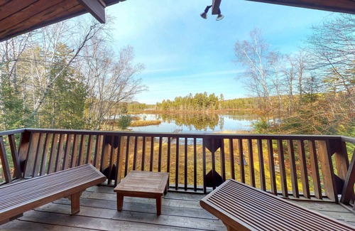 Enjoy a lovely view of Moose Pond at Happy Moose, with 100 feet of private lakefront just steps away. This gorgeous cabin-inspired house is perfect for getting away from it all, with all the amenities you need to be comfortable. When you're not enjoying fishing off the private dock, feel free to launch a kayak and explore the undeveloped parts of the lake. This home is a great hub for guests looking to get in some ice skating, snowshoeing, cross-country skiing, and snowmobiling throughout the seasons. In fact, Shawnee Peak ski center is just a short drive from the home. Feel free to wind down around the firepit when you need a rest. Indoors, the full kitchen features all the appliances needed to help you put together delicious meals. Throw some wood on the fireplace for an even cozier atmosphere. The gorgeous main bedroom upstairs features a furnished balcony and a desk workspace in case someone needs to complete assignments before relaxing. Amenities also include a private washer/dryer, gas grill, and a telescope for observing the stars as they come out over the lake. Enjoy all the amenities that the Knight's Hill community offers, including a swimming pool, tennis courts, and community beach.