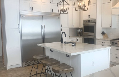 Cook like a pro with a gas burner cooktop, electric griddle, oversized fridge/freezer, and even a Margaritaville blender for your lakeside cocktails. Natural Gas BBQ on stamped concrete elevated patio. Enjoy large family meals around the rustic dining table, or head outside for al fresco dining by the water.