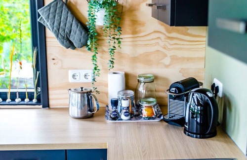 The fully equipped kitchen makes you feel right at home. With a ceramic hob, oven, dishwasher, and all the essentials, preparing your favorite meals is effortless. The kitchen comes with everything you need, including kitchen linens, a starter supply of coffee pods and tea, salt and pepper, various cleaning supplies, and dishwasher tablets.