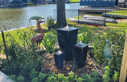 Over 70 feet of lakefront shoreline for guests to enjoy! 30 ft dock to accommodate any size boat. 3-person kayak, paddleboard and more are complimentary for guests. New pool spa cool deck surrounded by expansive lush and partly shaded grounds for enjoying outdoor games including cornhole, jumbo connect 4, and more. 1200 square foot upper outside deck with ample seating for relaxing or tanning. Two spacious covered areas for dining, cooking, relaxing without the worry of bugs due to bug misting system both levels. Enjoy Outdoor TV, refrigerator, portable evaporative cooler (Portacool), ceiling fans, 5-burner grill, huge portable ice container , folding stainless steel table for food prep and serving, and more to make your vacation the ultimate getaway.