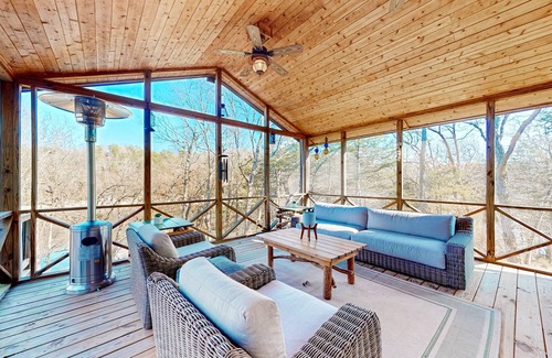 Lakefront retreat with screened sunroom, wood stove, multiple decks, & AC | House in Rogers
