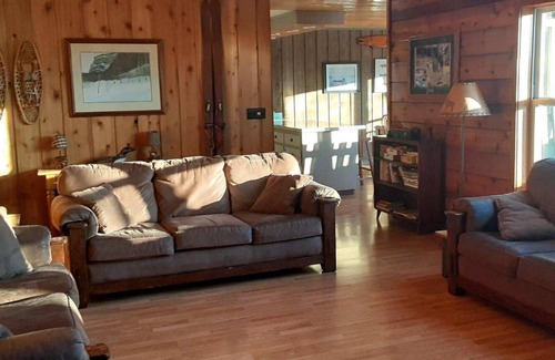 Almost the entire house interior is cedar or pine and the atmosphere is very lodge-like and while it is not a log cabin it is almost all wood inside and out. .