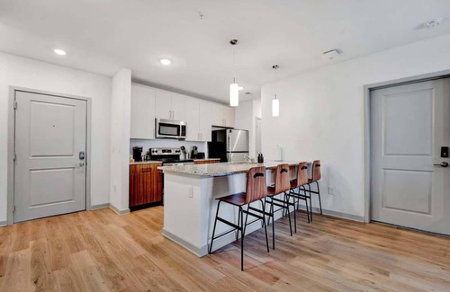 Step into style and comfort with thoughtfully designed spaces featuring luxurious wood-style flooring, stainless-steel appliances, and stunning tile backsplashes complemented by sleek granite countertops. Each home boasts high-powered Wi-Fi, a deluxe 65” flat-screen TV, and contemporary furnishings. Soaring nine-foot ceilings, designer lighting, and ceiling fans create an airy and inviting atmosphere.
