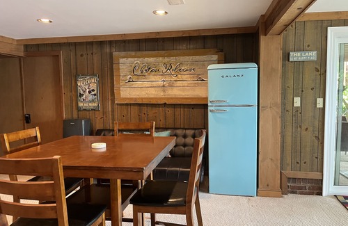 Upstairs has a large living room with 60" Flat Panel TV, DVD Player, a well equipped kitchen for cooking and eating with large groups, and 4 bedrooms (see bed sizes below). Downstairs has a large Rec Room, Theater Area, Large 75" Flat Panel TV, Foosball, Card Table and 1 additional Bedroom. Both the upstairs and downstairs lead out to large outdoor spaces which are a convenient ways to enjoy the views and lake. Upper deck features 2 gas grills and abundant seating and tables for maximizing time outdoors even during meals.