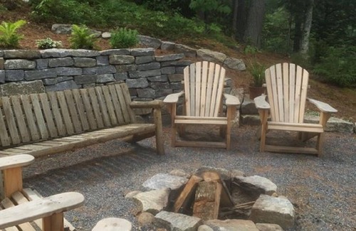The upstairs hallway, with its overlooking balcony, provides access to four bedrooms and a full bath. The large master bedroom offers a 5 x 6 plate glass window looking across to owls head mountain, and double-hung windows enable breathtaking views north. Another large bedroom will pamper your guests with its lovely vaulted ceiling, own vanity and wash area, large closet and yellow pine flooring. The third roomy bedroom is also vaulted and can easily sleep three children in two twin beds and a futon. The fourth bedroom is smaller but very cozy and quiet.