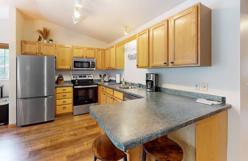 After a day of exploration, return to the cozy comfort of your retreat. Unwind in the living room, complete with vaulted ceilings and a stone fireplace, perfect for streaming your favorite shows or movies. When you're ready for a meal, take advantage of the well-equipped kitchen, featuring brand-new stainless steel appliances and plenty of prep space. Enjoy your meals at the breakfast bar, the dining table, or out on the balcony for an alfresco experience.