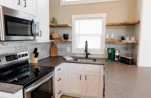 Step inside and be greeted by a thoughtfully designed space where every inch has been optimized for comfort and functionality. The sleek and chic interior features a stylish decor that exudes charm and character. Designed to sleep two, this tiny home features a king bed with luxury linens, a full bathroom with a walk-in shower and a double vanity. The well-equipped kitchenette beckons aspiring chefs to whip up delicious meals while the creature comforts such as high-speed Wi-Fi, washer and dryer, and designated parking for two vehicles, makes your home away from home a little...homier.