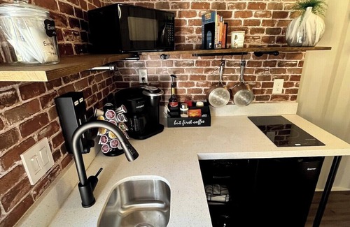 This space sleeps 2 guests comfortably, as it is one of two separate units in a 40 ft container. While your unit is completely private, you do share one half of the container with other guests. You are separated by a specially insulated wall, so you have plenty of privacy. You have your own living space with a bedroom, bathroom, and kitchenette area. The bedroom contains a full size bed, electric fireplace and a 52” Roku TV. The kitchenette has a sink, coffee maker, Keurig coffee pods, microwave, mini refrigerator, electric double countertop burner, utensils, grilling tools, small pots and pans, beer and wine opener, can opener and paper goods. Along with the upper deck, that is a shared space, you also have your own private patio with an outdoor stock tank hot tub just for you! You will also have access to the common areas, in our cozy fire pits and barbecue, where you can sit back and relax after your long days on the lake. The property is complete with a custom outdoor swimming hole in the common area that you can step into to cool yourself off!