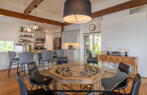 Relax--Zen inspired getaway just steps from Lake James. This home has everything you need to unwind and enjoy all that Lake James has to offer. A peaceful courtyard welcomes you at the entrance. Once inside you will feel your cares begin to slip away....Glass doors surround the entire house, revealing lake and mountain views. The open floor plan is newly renovated with bamboo flooring, new kitchen and updated bathrooms. A large covered deck with dining table with seating for 6 overlooks the lake with views of Shortoff Mountain, Table Rock and Grandfather Mountain. The main floor has a large round dining table that seats eight and bar seating for five. The kitchen comes fully equipped with everything you need, including a gas grill on the deck! Wood burning fireplace in great room for cozy fall evenings. The sleeping loft on the main level is accessible by ladder and has a full size bed, lamp, games and two fluffy, friendly stuffed animals to snuggle. Master bedroom on main level has lake and mountain views, king size bed and private bath with stone, tile and glass shower. The lower level has a foosball table and wet bar as well as a tv with dvd player, a large dvd collection full of family/kid friendly movies and Roku/YouTube TV for streaming shows. There are twin size bunk beds and a twin roll away in an alcove off the family room The bathroom on the lower level has been newly updated with granite countertop, tile, stone and glass shower. The bedroom on the lower level has a queen size bed and view of the lake.