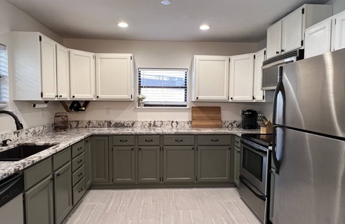 Attached the to dining room is a fully-renovated kitchen with granite countertops. The kitchen is equipped with a full refrigerator, electric stove, oven, Keurig coffee machine, and toaster. Included are full sets of dinnerware, cookware, drink ware, and utensils.