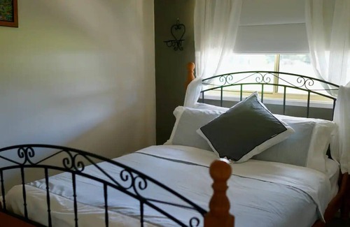 This large comfortable farmhouse welcomes you up a tree-lined driveway into a spacious 4-bedroom home with a gourmet kitchen for the entertainer & alfresco BBQ area. Enjoy the theatre lounge or soft sofas by the combustion fire, soft comfy beds, hot tub, fire pit, and games room. quiet and peaceful enjoy the wildlife, feed the friendly cow and calf and sheep. Collect eggs from the chickens.