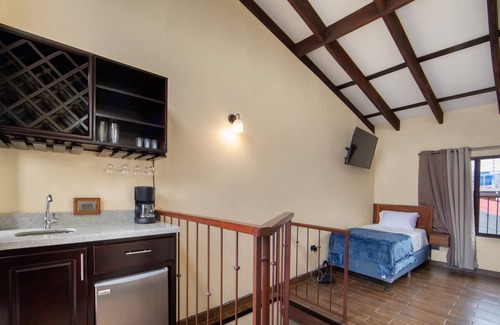 This apartment is located on a 2nd and 3rd floor of a three-story building, where the first floor is a restaurant. The rooms are very spacious with fine wood details and private bathrooms with hot water. There are two desks so you can install your workspace with comfortable chairs. On the 3rd floors we have a minibar with all the required equipment to prepare your hot/cold beverage and enjoy it on the balcony with great views of the central park, cathedral and Poas Mountains.