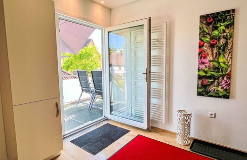 "Land in Sicht", 2-room apartment 60 m2, on the top floor. Bright, partly with sloping ceilings, beautiful and tasteful furnishings: living/sleeping room with 1 double sofabed (160 cm), dining table and satellite TV (flat screen). 1 room with 1 double bed and satellite TV (flat screen). Kitchen (oven, dishwasher, 4 ceramic glass hob hotplates, toaster, kettle, microwave, electric coffee machine). Exit to the balcony. Shower/WC. Heating. Balcony. Balcony furniture. Beautiful view of the garden. Facilities: children's high chair, baby cot. Internet (WiFi, free). Parking at the house. Please note: non-smokers only. Maximum 1 small pet/ dog allowed. Smoke alarm. Separate access to the apartment via external staircase (honeycomb steps).