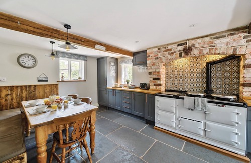 This delightful cottage comprises a spacious sitting room with a large inglenook fireplace and open fire which is the perfect space for relaxing. The impressive triple aspect kitchen with its cosy dining area is a bright and well equipped room with a grand Aga sitting centre stage and separate double ovens.