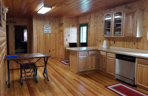 The walk out lower level has a family room with a large screen tv, a large reclining sectional, a separate room with a pool table and Foosball table and separate laundry room. The main level up the stairs has a living room with a reclining sectional & tv. The dining area has a table that seats 7 and there is additional seating in the kitchen. The kitchen has a dishwasher, microwave, and comes fully stocked with dishes, utensils, cookware, mixing bowls, coffee maker, toaster, griddle, waffle iron, George Foreman grill, crock pot, and bake ware. There are 3 bedrooms on the main level with brand new Restonic firm Queen Mattresses and Box springs: The master has a king bed and tv with full master bathroom attached. Bedroom 2 & 3 are large and set up the same with 2 queen beds with dressers in each. Main level bathroom has a tub shower combo and a double sink. The 24'x24' loft area could be used as a fourth bedroom and has a king size bed and 2 queen beds. (it has a tv that only runs a dvd/vcr combo with a small selection of videos available.) There are no bunk beds in this cabin. All rooms except kitchen and bathrooms have ceiling fans. Off the main level there are 2 decks. The deck off the kitchen is 14'x18' and the deck off the living room is 12'x18'. There is patio seating for 14 and 4 tables, plenty of room to enjoy outdoor eating. There is a charcoal grill available for use. Bonfire area available to enjoy evenings around the fire. There is lots of outdoor space for kids to run around in.