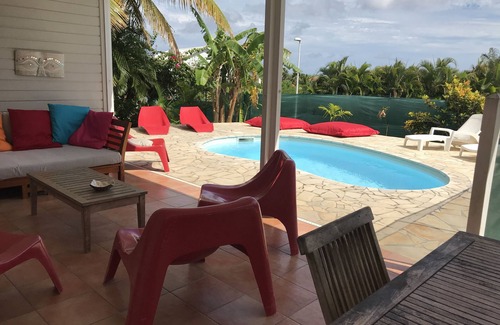 Large friendly and comfortable villa that can accommodate 10 people, in a quiet residence close to the beach. A beautiful L-shaped terrace, a real living room with its living room and day bed, teak tables, hammock, overlooking the secure swimming pool, and its tropical and fenced garden.