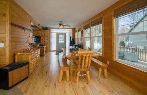 This home boasts a stunning open layout, complemented by pine wall accents, and features a spacious wrap-around deck. Enjoy fishing from the dock, dipping your toes at the sandy beach cove, or engaging in water sports with your own boat. Our guest book is filled with fishing tales – though the truth of some may be as elusive as the fish themselves. Surrounded by large windows, the main level offers panoramic lake views through 27 of its 31 windows, alongside a kitchen adorned with granite countertops and a double oven.