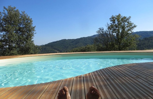 In the southern Ardèche, our large gite made of wood and golden stone, has 4 bedrooms, each with a bathroom or shower and separate toilets. The kitchen-living room opens onto the large terrace where you will spend superb moments with family or friends. It overlooks a magnificent PRIVATE POOL at the wooden beach where naturism is possible ... In winter, the stove will bring you together for beautiful evenings ... A thousand and one activities will occupy your days without going far ... Your hosts will welcome you at their table d'hôte in the evening, if you wish to taste the vegetables and garden fruits, organic beef or pork from our farm and our local specialties!
