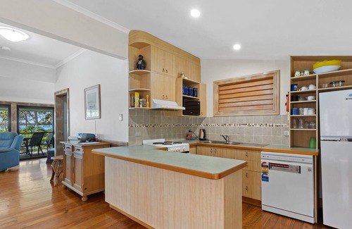 This holiday house is uniquely designed and being on two levels it is ideal for the extended family or two families. You will get the lovely bay breezes as the house is situated high on the headland.