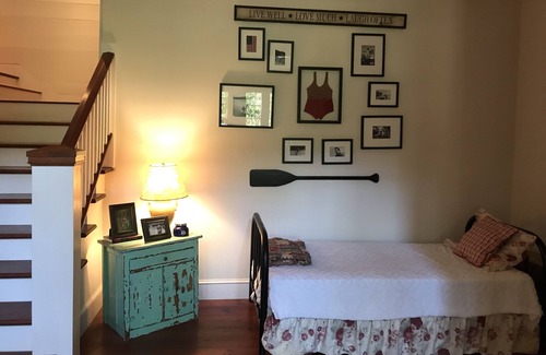Details: Our home was built in 2000 and has approximately 5000sq ft. We are located in a quiet cove with deep water and beautiful views. The home features large open spaces with water views from almost every room. Great for gathering with friends and family or for finding a quiet nook to read or nap. The main floor boast a two story great room with a large stone fireplace, a 55" TV and antler chandeliers. It is open to a well stocked kitchen and dining area. One of the master suites is off the great room with private access from the lakeside porch. A mudroom with half bath, laundry, pantry and porches round out the main floor. The second floor features a second large master bedroom with a king bed, single bed and a balcony. A second bedroom has a queen bed and its own balcony lake side. Sharing a hall bathroom, the remaining bedroom has a queen bed. The third floor features a second den with futon and extra sleeping accommodations. This is a great place for the kids to hangout for games/TV etc... or just as a slumber party space. Located lakeside with access from the great room is a screened porch with fireplace that remains my favorite part of the home. From your first cup of coffee in the morning to the late night chats by the fire, this space is surely to become one of your favorites as well. Adjoining spaces include open covered porches and a grilling area with both a charcoal barrel grill and small weber grill. From here your walk to the lake is concrete and short. The dock has chairs and floats for your convenience and the lake, pasture land and trees provide the fabulous backdrop. Bring your boat/PWC or rent one from the close by marina to tour the lake. There are games, movies and puzzles to enjoy and of course plenty of books to read. So whether it is spring, summer, fall or winter there is always something to do. And don't forget, with the close proximity to Clemson and Athens, our place is a great home base for those football or graduation weekends. Pet friendly with a fee.