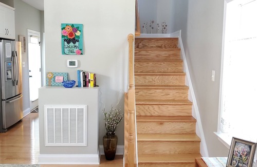 On the main level of the home, you'll find comfort & fun & plenty of space to stretch out. You'll appreciate the tankless water heater, the real red oak flooring, the soft close wht kitchen cabinetry, the lrg dbl-door stainless-steel refrigerator, all the quirky art finds, our tiny kitchen library, the open-concept living/dining/kitchen area & the private paver stone patio just outside the kitchen where you can sit outside to enjoy a meal.