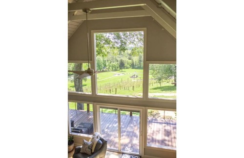The enormous deck overlooks the beautifully maintained Ramble Creek Events property and venue, but just past that you'll see gorgeous farmland and mountain views. Just behind the house is the custom resort style pool, lounge chairs, a fire pit with chairs, and grill.