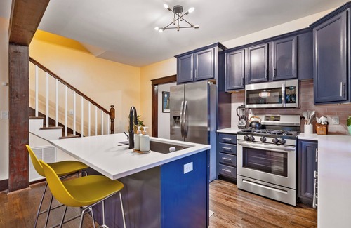 The fully-stocked kitchen includes all stainless steel appliances, gas range and stove, Keurig coffee maker with complimentary K-cups, dishwasher, blender, air fryer, toaster, and all the essential cookware, bake ware, silverware, and pots & pans needed for staying in and making meals.