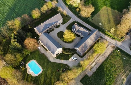 On the ground floor: a kitchen with dining area and relaxation area, a large living room with fireplace, a dining room, an office with sofa, a bathroom with double sinks and separate shower, separate toilet. Upstairs: a large landing leads to a bedroom with a 160x200 bed and its open bathroom with bathtub and two sinks, a bedroom with two 80x190 beds, a bedroom with two 80x200 beds that can be converted into a 160x200 double bed, a bedroom with a 160x200 bed, a bathroom with bathtub and two sinks, a laundry room. Electric heating with heat pump included in the rates. 5 km south of Fougères, in the countryside in the heart of a group of carefully renovated 17th and 18th century buildings, this large gîte offers 280 m² of luxury living space in a warm atmosphere. The ground floor, air-conditioned by the floor, offers 140 m² of open spaces with all the comforts that invite you to relax: numerous sofas, fireplace, music, reading material. You can enjoy the property's swimming pool (unheated pool, accessible all year round, shared with the owners). The pool measures 11 x 5 m. with a depth of 1.70 m. in the middle of the pool. A wooden acoustic cinema (€50 for 8 people) and a wellness area, with sauna and whirlpool baths, (paying €200/afternoon for 8 people), can be privatized by reservation with the owner.