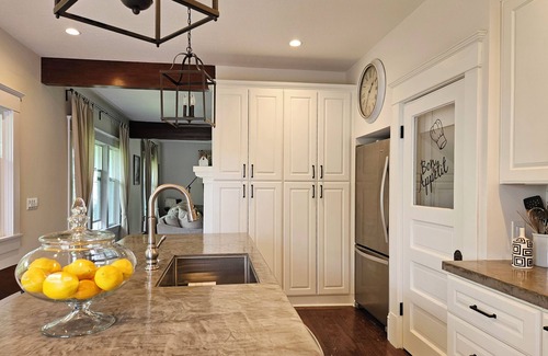 Large stylish, open concept home with hardwood floors, sun porch, clawfoot soaking tub, full kitchen setup and lots of extras like local artesian soaps and non-toxic supplies.