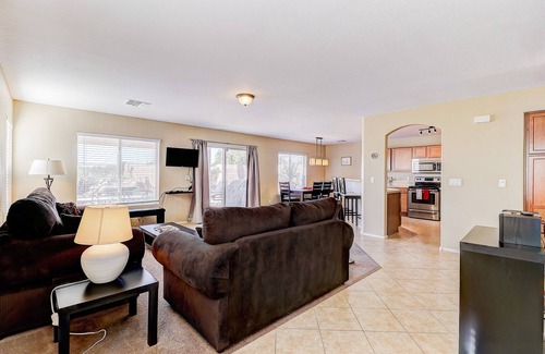 Large open concept main floor with a dining, kitchen combo where stools and island lead into spacious sitting area to relax in. Upstairs there is an open media room with big HD TV and comfy sectional sofa with great views of the course and mountains.