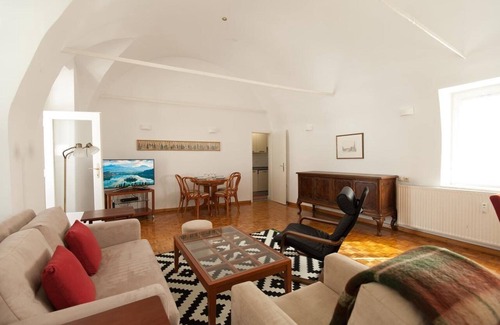 The apartment is located opposite the Town Hall at Mestni trg in the famous Souvan House, the square's highest building with a 17th century Empire-style facade decorated with Francesco Coconi's reliefs representing art, trade and agriculture. It is an ideal starting point for exploring and experiencing Ljubljana.