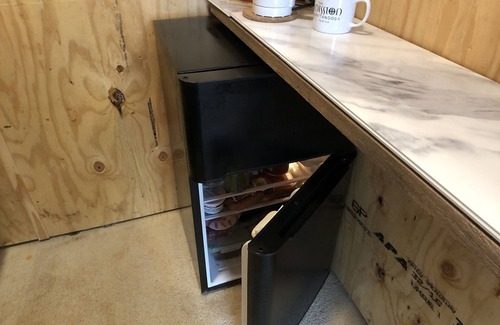 Camper and bathhouse are complete with electrical receptacles and USB ports to keep your devices charged while you retreat from the world.