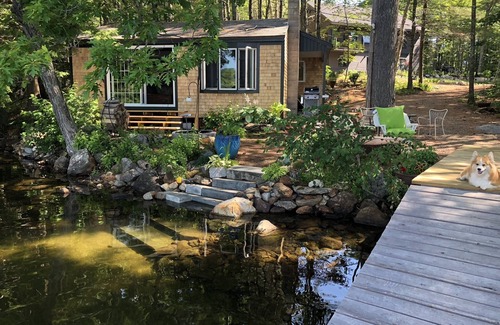Perfect lake experience. South facing, 8' from pond's edge, crystal clear water, dock and steps into water. Wonderful swimming. Lots of fish! Bring your kayak and fishing pole or use our rowboat or canoe. One bedroom with comfortable king size bed, living room, eating area, Den/TV room with DVDs. WiFi. Shower bath and washer dryer. QUIET. Amenities are excellent -- Little luxuries in the woods. We are very close to Camden, Rockport, Belfast, Lincolnville and Rockland all of which have excellent restaurants, good shopping and many things to do.