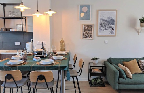 - Living area: The modern, fully-equipped open-plan kitchen is perfect for preparing tasty meals. A high table invites you to share convivial moments, while the cosy, bright lounge area is ideal for relaxing after a day of exploring.