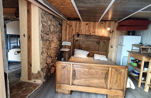 D'une piece de vie avec une table 4/5 places, un canapé 3 places (ou un lit superposé) avec une télé connectée si mauvais temps. Cette pièce est surplombée par une mezzanine (attention à la tête pour les grands!!!) aménagée avec un lit en 120 d'époque (accès d'un seul coté). Le lit superposé (190x90) pour les familles de 2 enfants limite concidérablement l'espace et la circulation de cette piece si vous sopuhaitez garder le canapé . Un climatiseur et un ventilateur de plafond ont été mis dans cette pièce chauffée par un poêle à granulé.